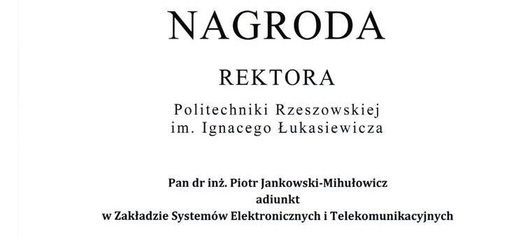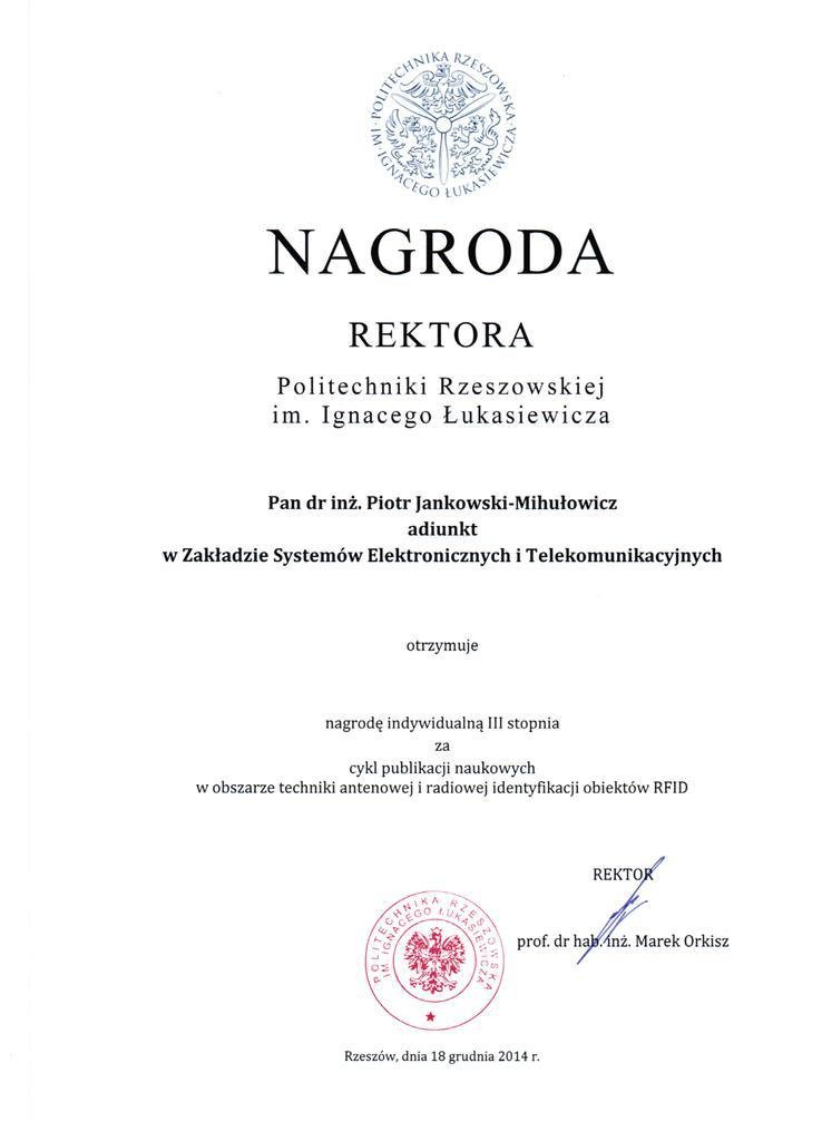 18 grudnia 2014 r. podczas uroczystego posiedzenia Senatu Politechniki Rzeszowskiej dr inż. Piotr Jankowski-Mihułowicz otrzymał indywidualną nagrodę Rektora PRz (III stopnia) za cykl publikacji naukowych w obszarze techniki antenowej i radiowej identyfikacji obiektów RFID.