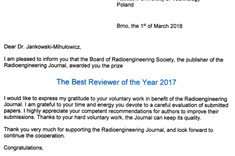 W dniu 9 lutego dr hab. inż. Piotr Jankowski-Mihułowicz, prof. PRz znalazł się w grupie sześciu osób uhonorowanych nagrodą Best Reviewer Award 2017, która została przyznana za jakość, szybkość i rzetelność pracy recenzenta w międzynarodowym czasopiśmie Radioengineering indeksowanym w Journal Citation Reports (Print ISSN: 1210-2512, On-line ISSN: 1805-9600).