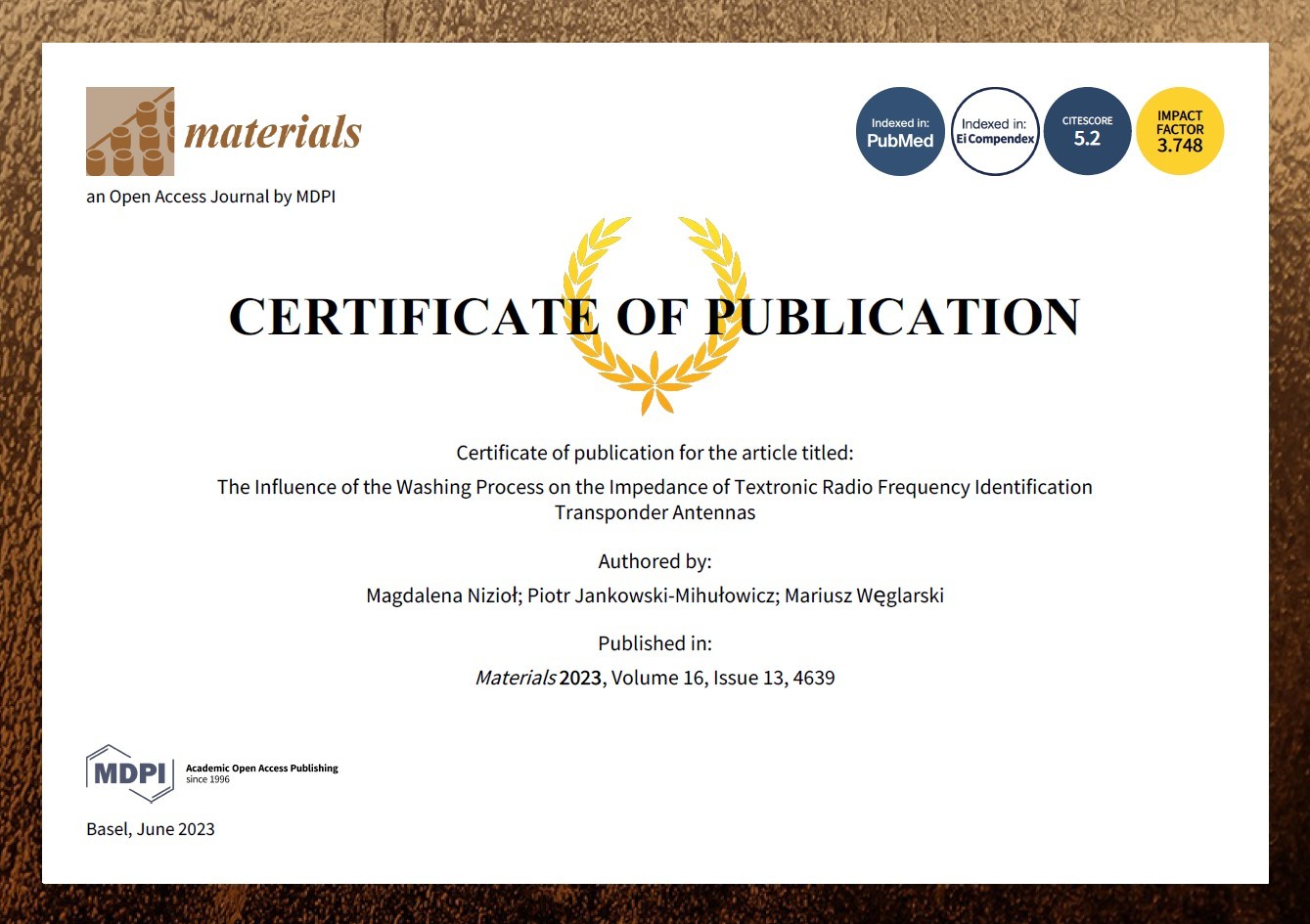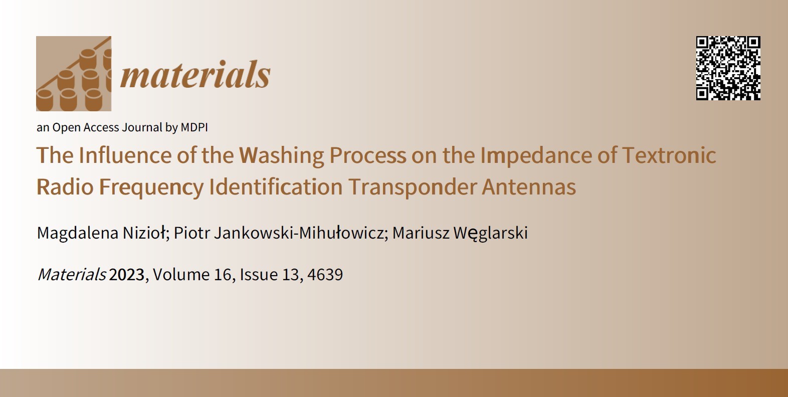 Nizioł M., Jankowski-Mihułowicz P., Węglarski M.: The Influence of the Washing Process on the Impedance of Textronic Radio Frequency Identification Transponder Antennas, Materials, Vol. 16, No. 13, 4639, 2023 (DOI: 10.3390/ma16134639).