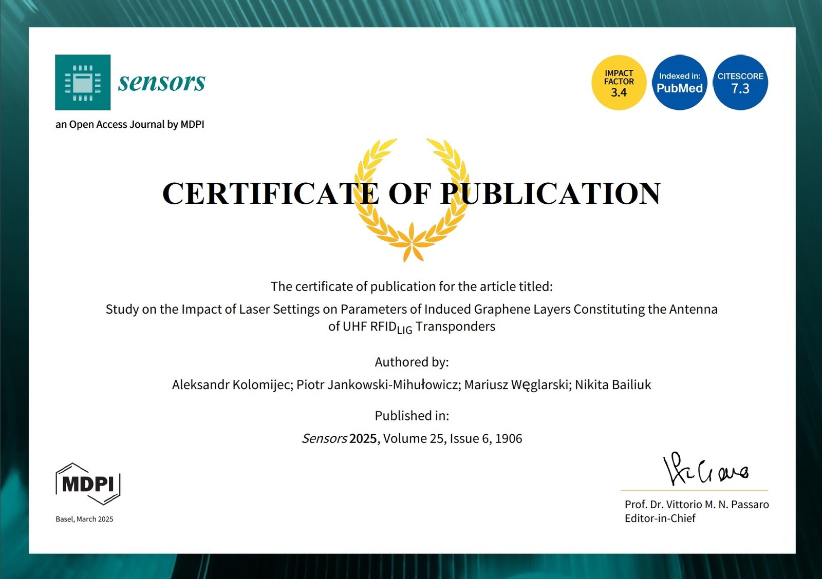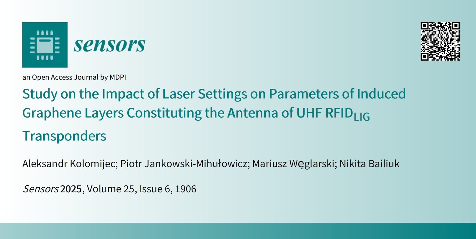 Kolomijec A., Jankowski-Mihułowicz P., Węglarski M., Bailiuk N.: Study on the Impact of Laser Settings on Parameters of Induced Graphene Layers Constituting the Antenna of UHF RFIDLIG Transponders, Sensors, Vol. 25, No. 6, 1906, 2025 (DOI: 10.3390/s25061906).