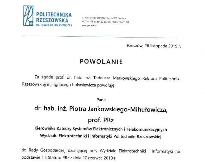 W dniu 26 listopada 2019 r. odbyło się pierwsze posiedzenie nowej Rady Gospodarczej powołanej przy Wydziale Elektrotechniki i Informatyki Politechniki Rzeszowskiej im. Ignacego Łukasiewicza. Za zgodą prof. dra hab. inż. Tadeusza Markowskiego Rektora Politechniki Rzeszowskiej, na podstawie § 5 Statutu PRz z dnia 27 czerwca 2019 r., Dziekan WEiI dr hab. inż. Mariusz Korkosz, prof. PRz powołał w skład Rady zaproszonych przedstawicieli przedsiębiorstw, środowisk społecznych, instytucjonalnych i naukowych. W skład tego Grona został powołany także dr hab. inż. Piotr Jankowski-Mihułowicz, prof. PRz, który dodatkowo miał przyjemność zaprezentować zgromadzonym Gościom obszar współpracy jednostek WEiI z przemysłem w zakresie elektroniki i telekomunikacji.