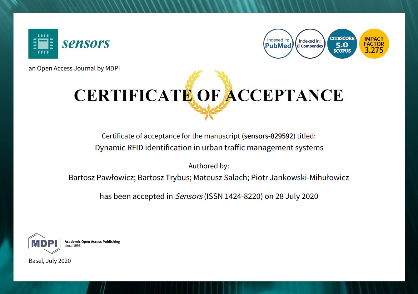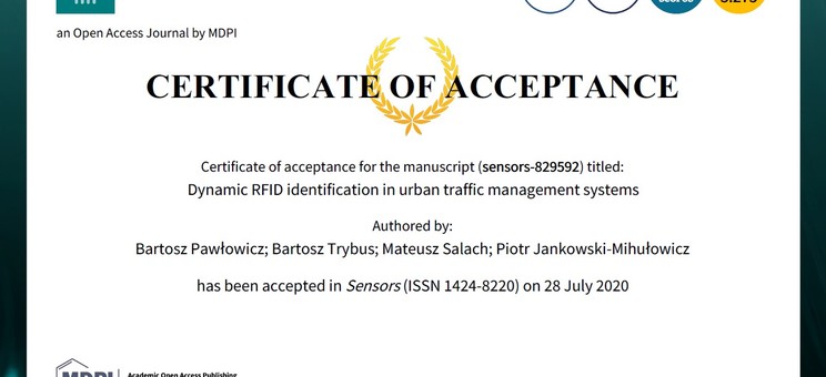 Pawłowicz B., Trybus B., Salach M., Jankowski-Mihułowicz P: Dynamic RFID Identification in Urban Traffic Management Systems, Sensors, ISSN: 1424-8220, Vol. 20, No. 15, 4225, 2020 (DOI: 10.3390/s20154225).