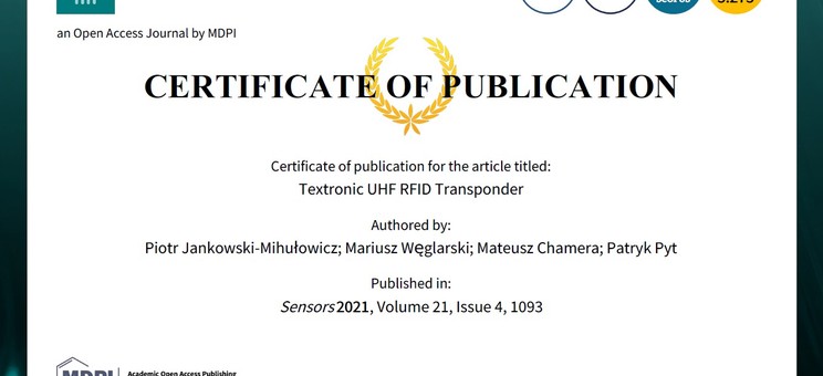 Jankowski-Mihułowicz P., Węglarski M., Chamera M., Pyt P.: Textronic UHF RFID Transponder, Sensors, ISSN: 1424-8220, Vol. 21, No. 4, 1093, 2021 (DOI: 10.3390/s21041093).