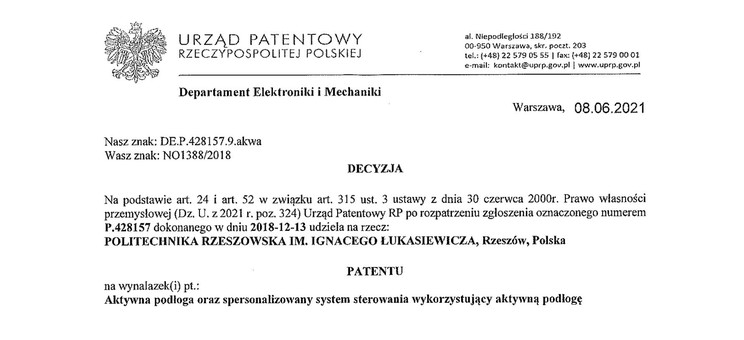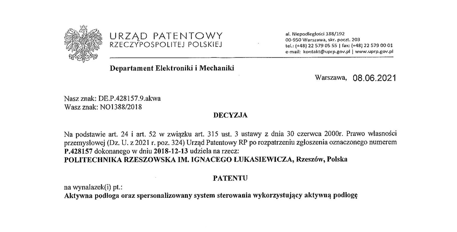 W dniu 8 czerwca 2021 r. Urząd Patentowy Rzeczypospolitej Polskiej po rozpoznaniu zgłoszenia oznaczonego numerem P.428157, dokonanego w dniu 13.12.2018 r., udzielił na rzecz Politechniki Rzeszowskiej im. Ignacego Łukasiewicza patentu na wynalazek pt. „Aktywna podłoga oraz spersonalizowany system sterowania wykorzystujący aktywną podłogę”, którego autorami są: dr hab. inż. Piotr Jankowski-Mihułowicz, prof. PRz, dr inż. Mariusz Węglarski, prof. PRz oraz mgr inż. Patryk Pyt.
