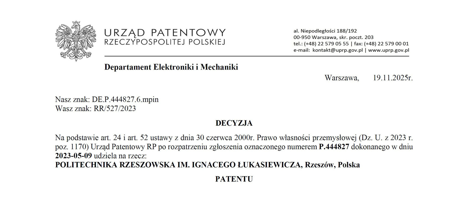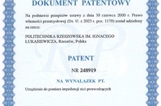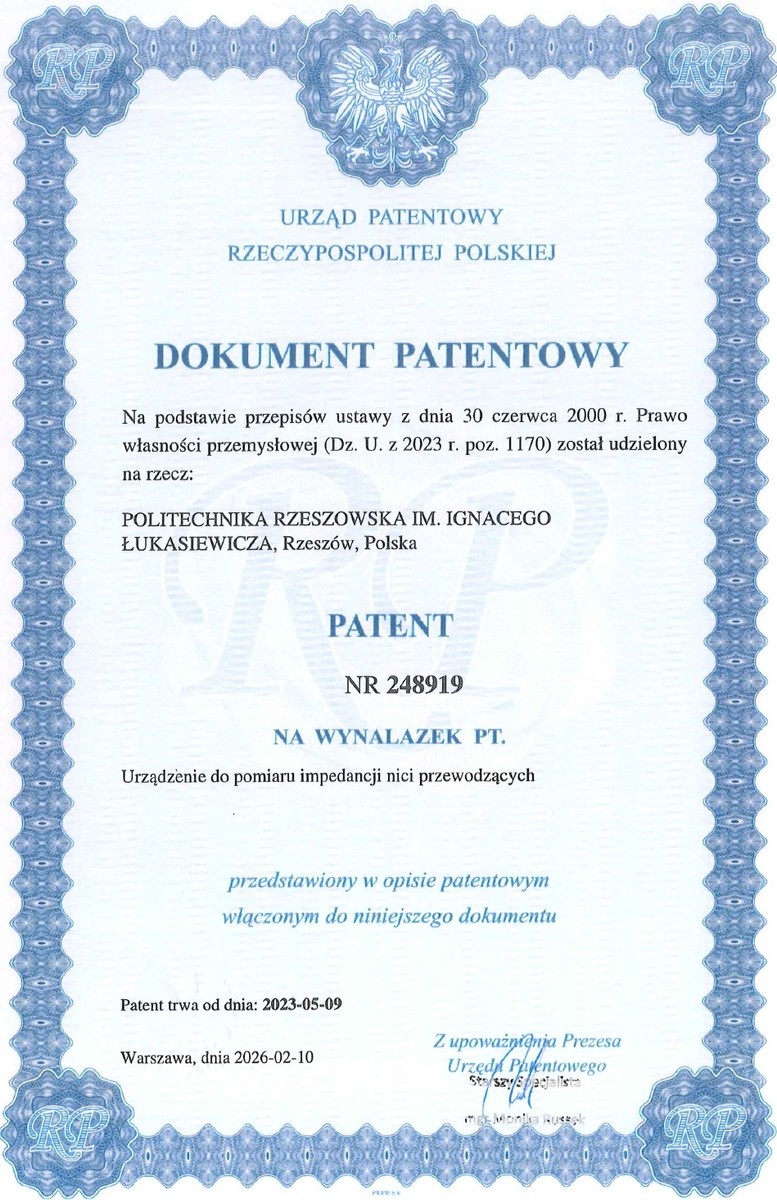 W dniu 19 listopada 2025 r. Urząd Patentowy Rzeczypospolitej Polskiej po rozpoznaniu zgłoszenia oznaczonego numerem P.444827, dokonanego w dniu 09.05.2023 r., udzielił na rzecz Politechniki Rzeszowskiej im. Ignacego Łukasiewicza patentu na wynalazek pt. „Urządzenie do pomiaru impedancji nici przewodzących”, którego autorami są: dr hab. inż. Piotr Jankowski-Mihułowicz, prof. uczelni, dr inż. Mariusz Węglarski, prof. uczelni oraz mgr inż. Patryk Pyt. Publikacja patentu nastąpiła w dniu 09.02.2026 r.