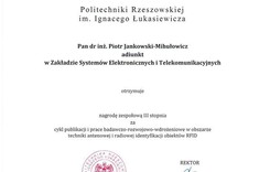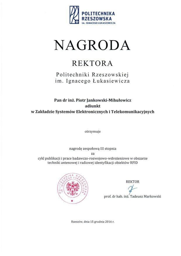 15 grudnia 2016 r. podczas uroczystego posiedzenia Senatu Politechniki Rzeszowskiej dr inż. Piotr Jankowski-Mihułowicz otrzymał zespołową nagrodę Rektora PRz (III stopnia) za cykl publikacji i prace badawczo-rozwojowo-wdrożeniowe w obszarze techniki antenowej i radiowej identyfikacji obiektów RFID.