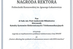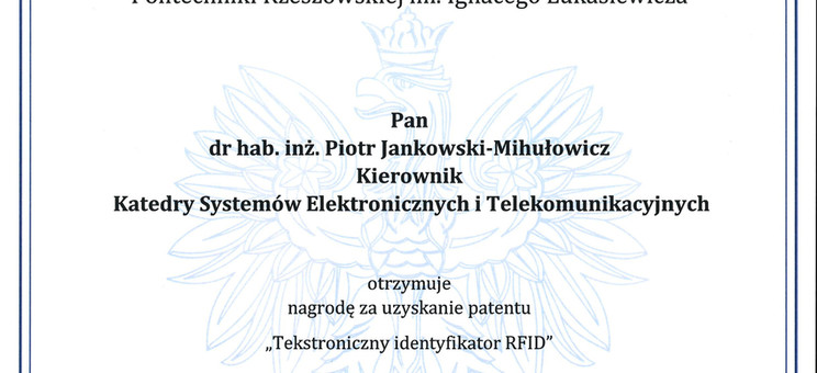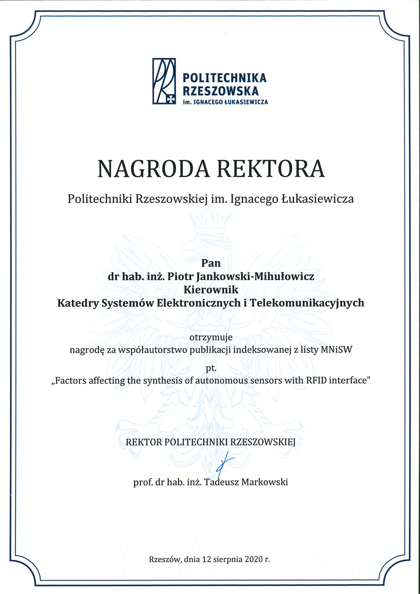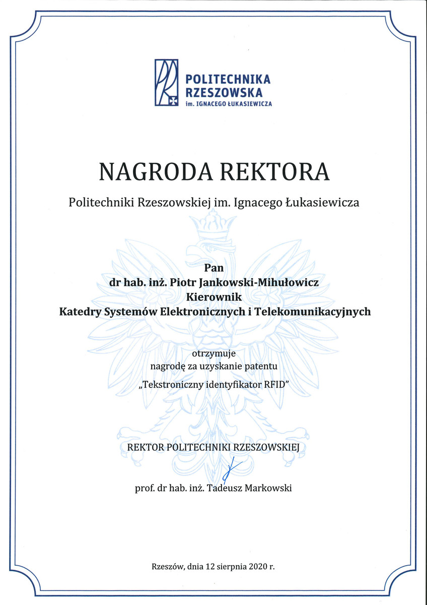18 sierpnia 2020 r. dr hab. inż. Piotr Jankowski-Mihułowicz, prof. PRz otrzymał dwie zespołowe nagrody Rektora PRz za osiągnięcia naukowe uzyskane w 2019 r. Pierwsza z nagród została przyznana za uzyskanie patentu na wynalazek pt. Tekstroniczny identyfikator RFID (UP RP, nr prawa wyłącznego: PAT.231291), natomiast druga - za współpautorstwo publikacji pt. Factors affecting the synthesis of autonomous sensors with RFID interface (Sensors, ISSN: 1424-8220, Vol. 19, No. 20, 4392, 2019, DOI: 10.3390/s19204392).