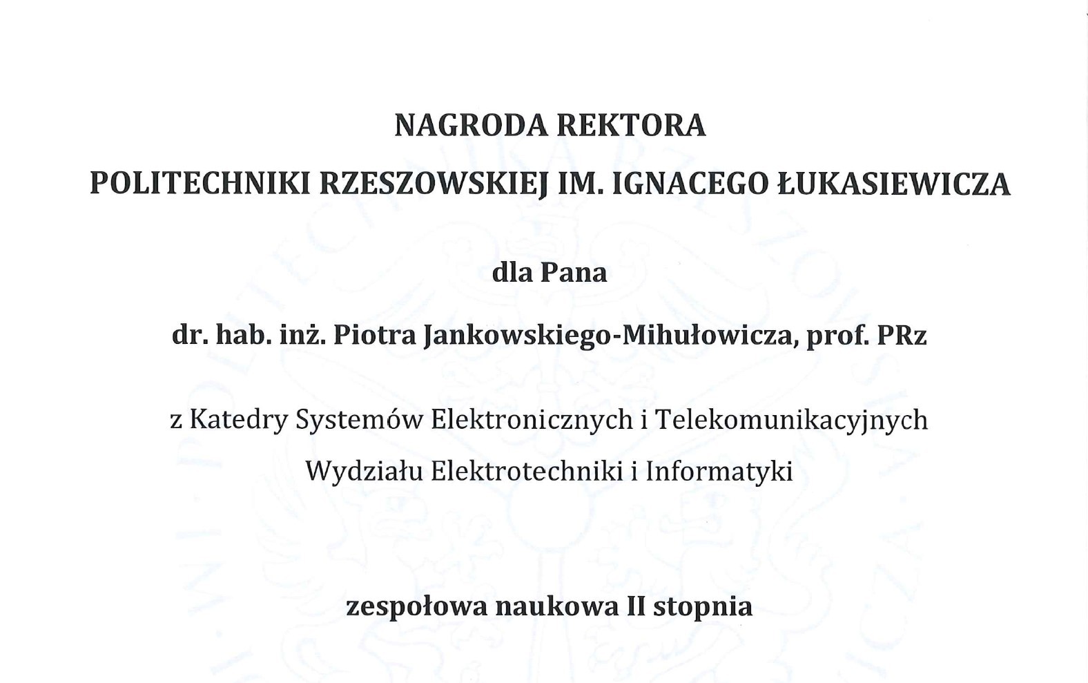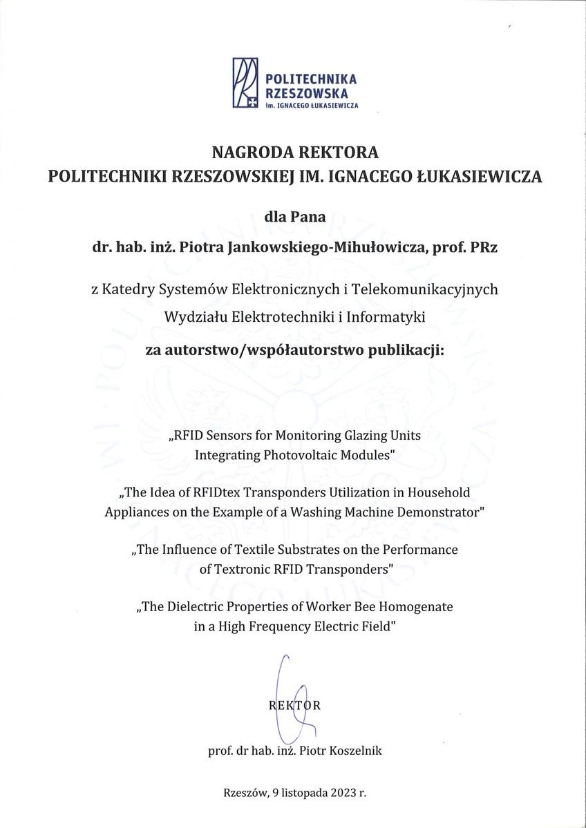 9 listopada 2023 r. dr hab. inż. Piotr Jankowski-Mihułowicz, prof. PRz otrzymał zespołowe nagrody Rektora PRz za osiągnięcia naukowe uzyskane w 2022 r.: