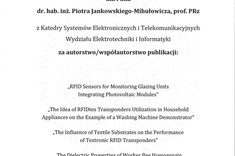 - Pawłowicz B., Kołcz M., Jankowski-Mihułowicz P.: The Idea of RFIDtex Transponders Utilization in Household Appliances on the Example of a Washing Machine Demonstrator, Energies, ISSN: 1996-1073, Vol. 15, No. 7, 2639, 2022 (DOI: 10.3390/en15072639).