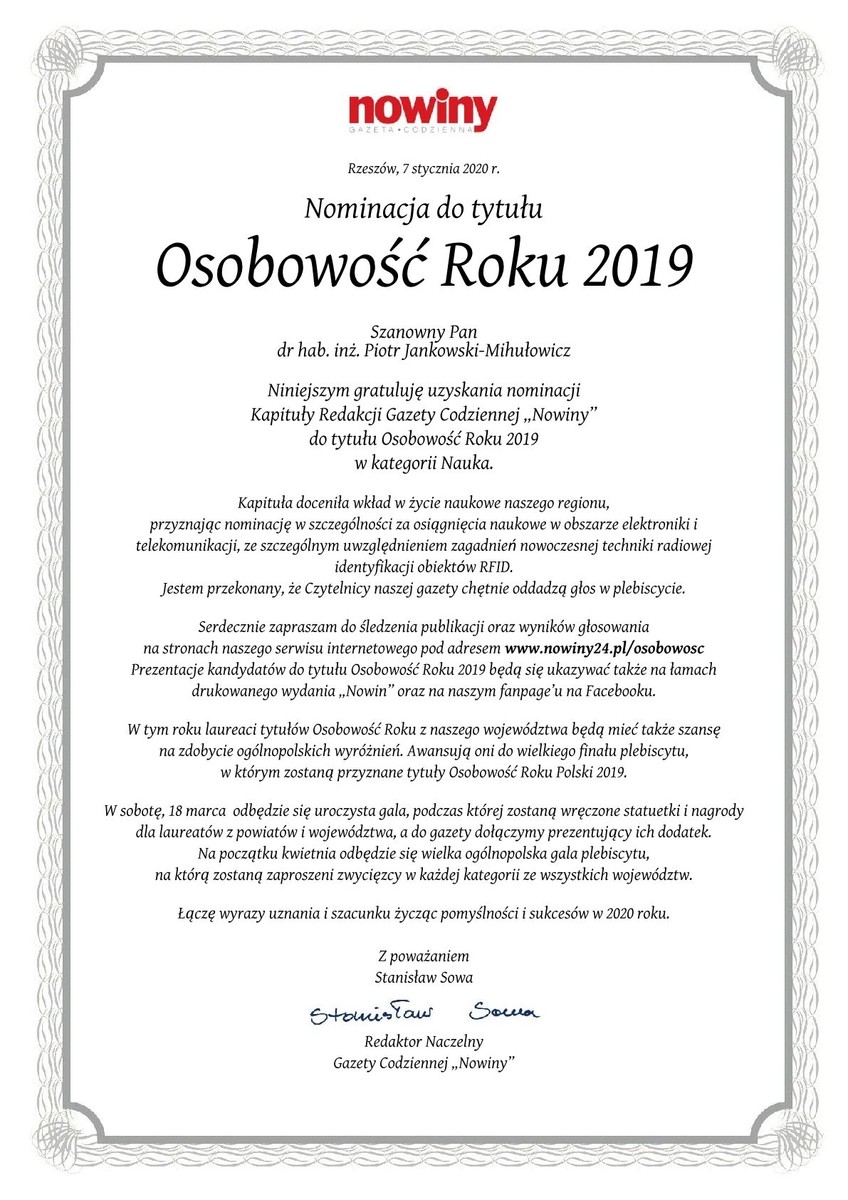 W dniu 7 stycznia 2020 r. Kapituła Redakcji Gazety Codziennej „Nowiny” nominowała dra hab. inż. Piotra Jankowskiego-Mihułowicza, prof. PRz do tytułu Osobowość Roku 2019 w kategorii Nauka. Kapituła doceniła wkład kandydata w życie naukowe Podkarpacia przyznając tę nominację w szczególności za osiągnięcia naukowe w obszarze elektroniki i telekomunikacji, ze szczególnym uwzględnieniem zagadnień nowoczesnej techniki radiowej identyfikacji obiektów (RFID – ang. Radio Frequency IDentification).