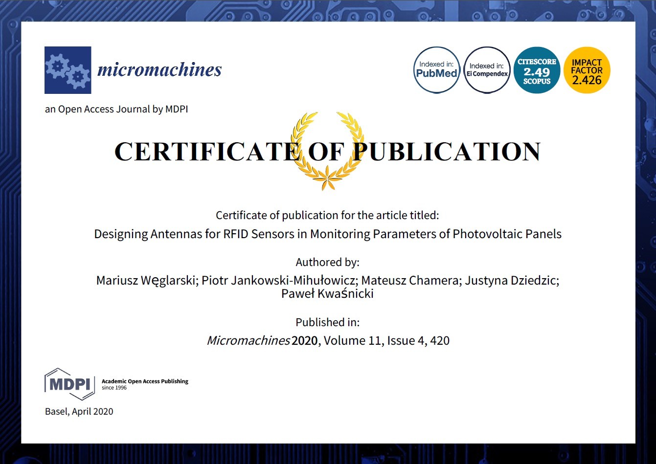 Węglarski M., Jankowski-Mihułowicz P., Chamera M., Dziedzic J., Kwaśnicki P.: Designing Antennas for RFID Sensors in Monitoring Parameters of Photovoltaic Panels, Micromachines, 420, ISSN: 2072-666X, Vol. 11, No. 4, 420, 2020 (DOI: 10.3390/s20010268).