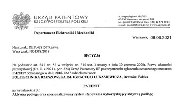 8 czerwca 2021 r. Urząd Patentowy RP udzielił na rzecz PRz patentu na wynalazek pt. "Aktywna podłoga oraz spersonalizowany system sterowania wykorzystujący aktywną podłogę" (P.428157) (...)