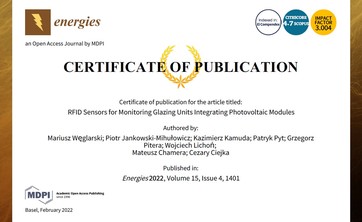 15 lutego 2022 r. ukazała się kolejna publikacja z zakresu techniki RFID: Synthesis of antennas for active glazing unit with photovoltaic modules (...)