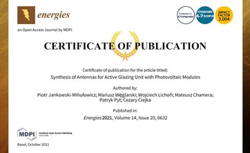 W dniu 14 października 2021 r. ukazała się nowa publikacja: Synthesis of antennas for active glazing unit with photovoltaic modules (...)