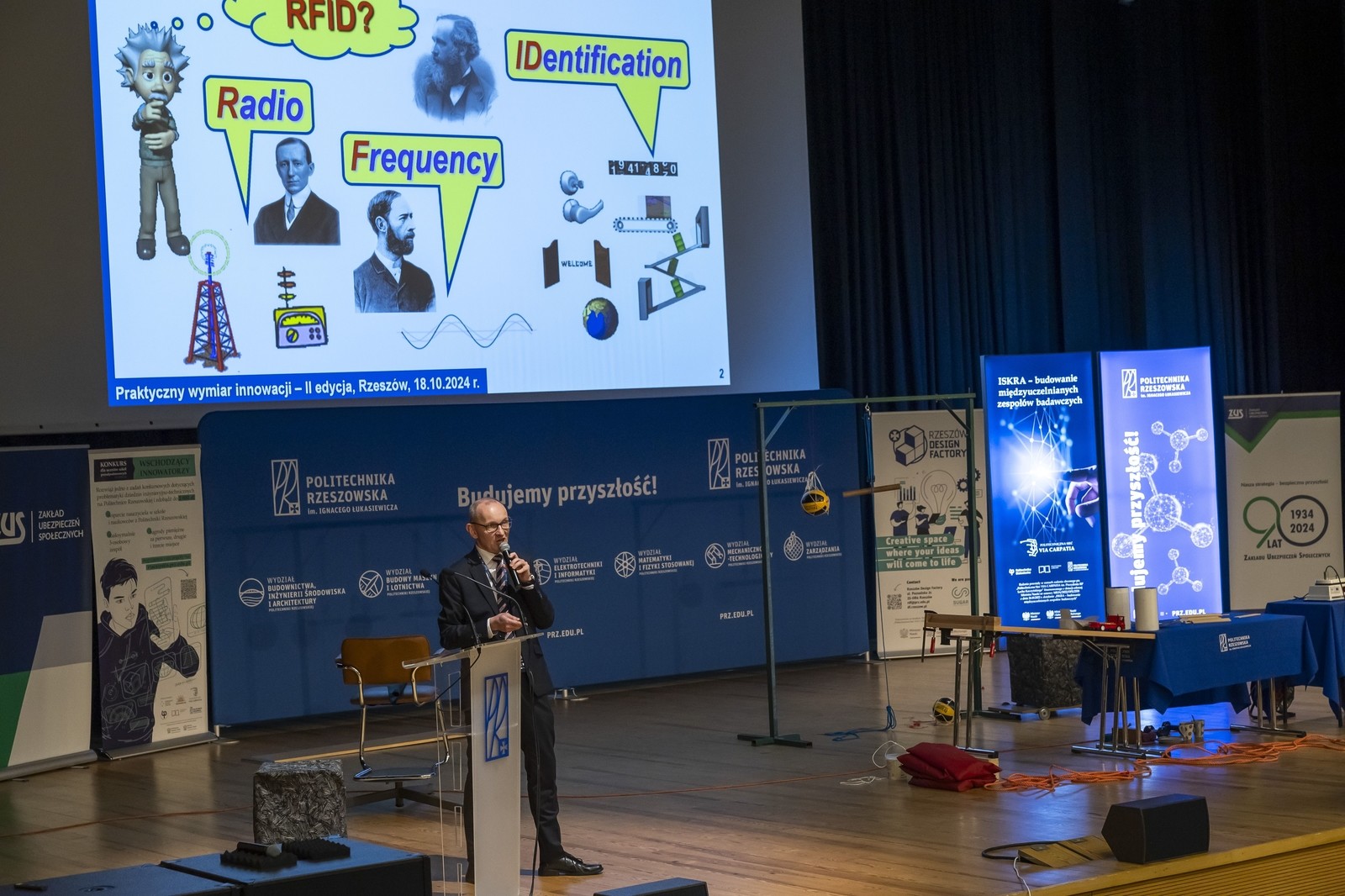 W trakcie konferencji dr hab. inż. Piotr Jankowski-Mihułowicz, prof. PRz opowiedział uczniom szkół średnich o „Technice radiowej identyfikacji obiektów RFiD – dzisiaj i jutro”. Tematyka tego wykładu dotyczyła stanu obecnego i nieodległej przyszłości, jaka wyłania się z innowacji, które od 25 lat z sukcesem są kreowane na PRz przez prowadzącego wykład i jego zespół z Zakładu Systemów Elektronicznych i Telekomunikacyjnych na Wydziale Elektrotechniki i Informatyki. Jest to efekt intensywnej współpracy zespołu ZSEiT z otoczeniem społeczno-gospodarczym w zakresie elektroniki i telekomunikacji, a osiągnięcia te są wynikiem unikatowej wiedzy i doświadczenia, a także uzyskanych patentów i ich wdrożeń w gospodarce.