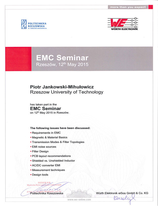 12 maja 2015 r. w Politechnice Rzeszowskiej odbyło się seminarium EMC, które zostało wspólnie zorganizowane przez Würth Elektronik Polska i pracowników Zakładu Systemów Elektronicznych i Telekomunikacyjnych pod patronatem Dziekana Wydziału Elektrotechniki i Informatyki dra hab. inż. Grzegorza Masłowskiego, Prof. PRz oraz Polskiej Sekcji IEEE EMC–S.