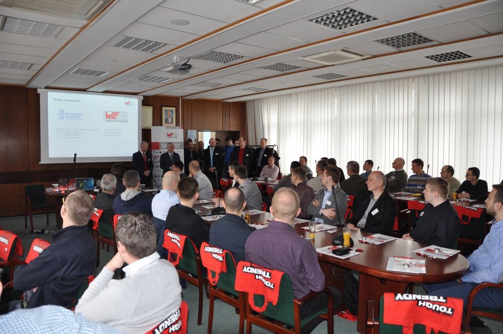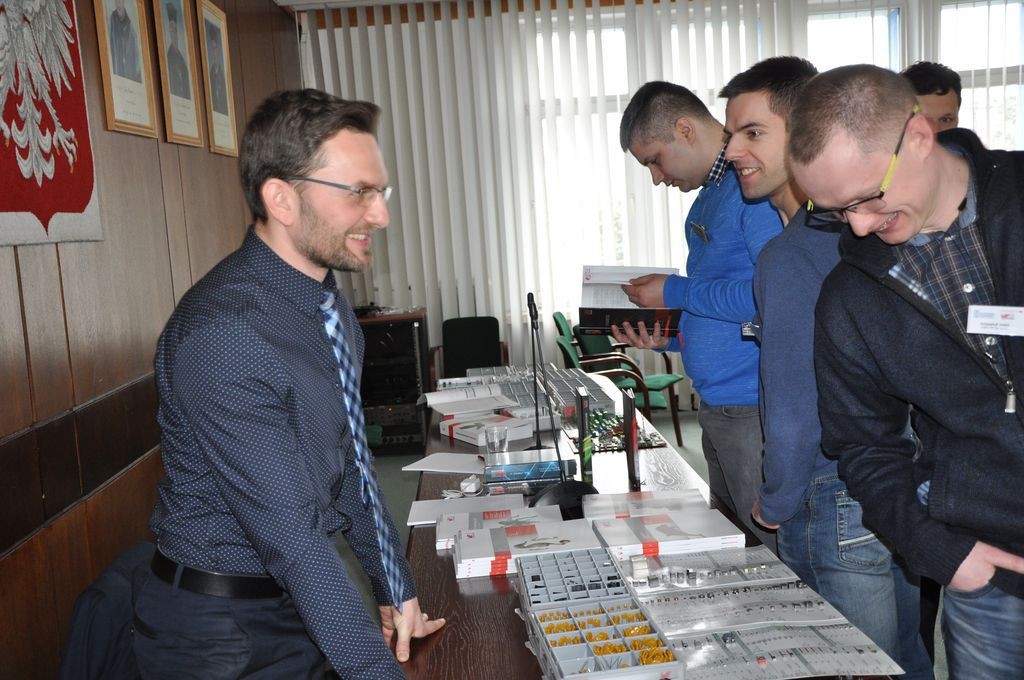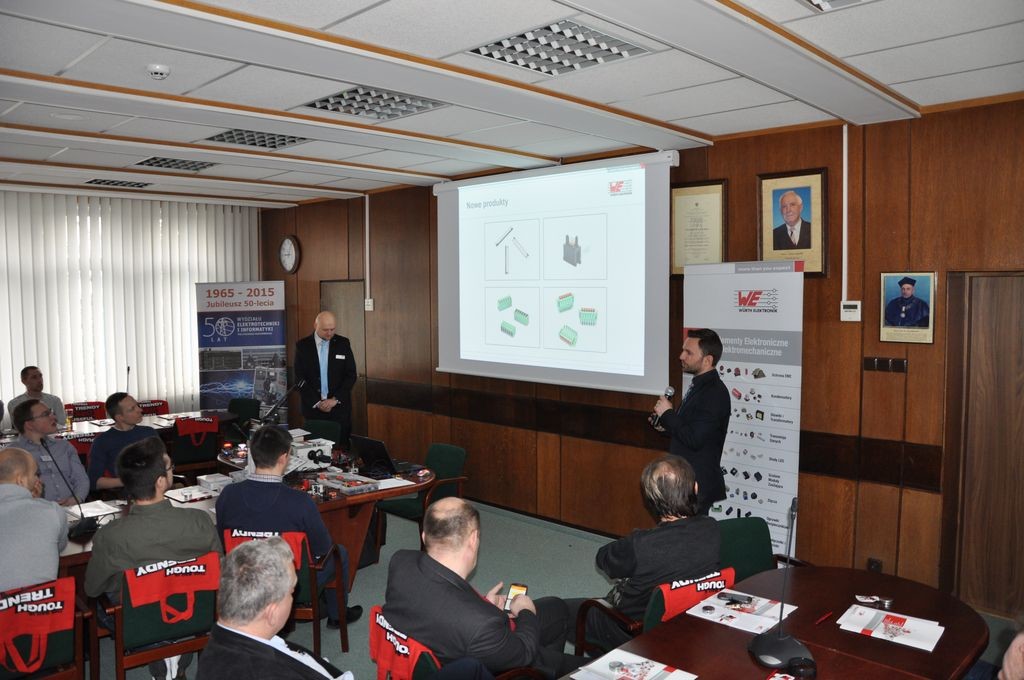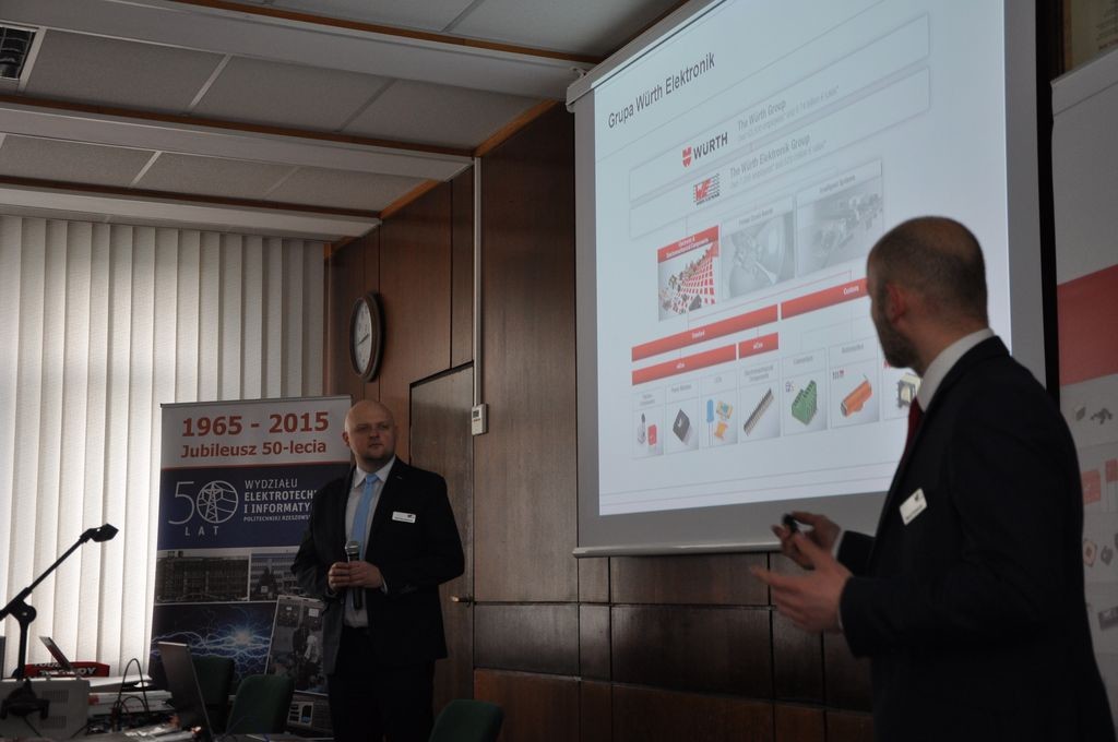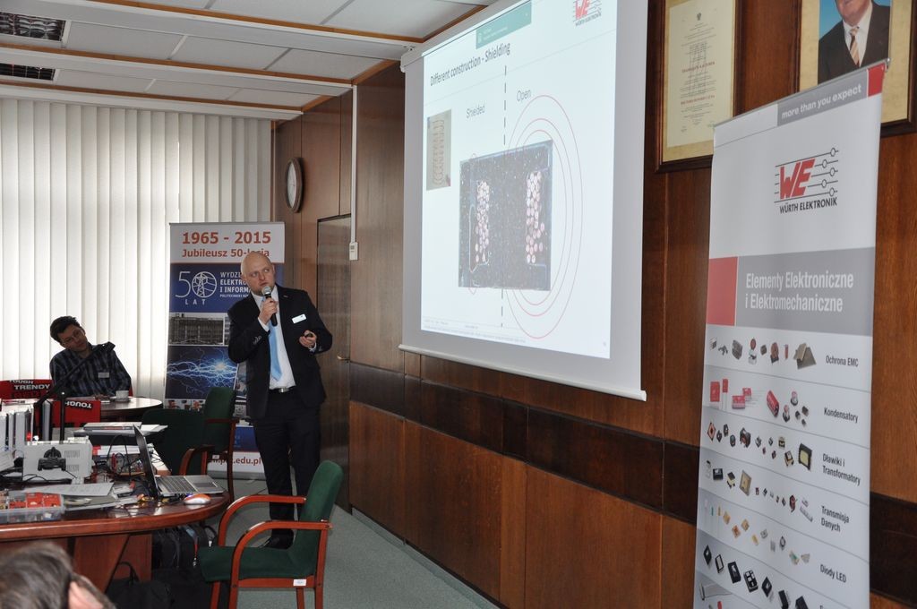 Seminarium było prowadzone przez mgr. inż. Piotra Gierwiatowskiego, inżyniera aplikacyjnego z firmy Würth Elektronik, który wprowadził jego uczestników w problematykę projektowania przetwornic DC/DC. Komponenty te są integralną częścią każdego urządzenia zasilanego z sieci elektroenergetycznej, baterii, akumulatorów itp. zasobników energii. W kilku blokach tematycznych, które były wsparte praktycznymi prezentacjami z wykorzystaniem aparatury kontrolno-pomiarowej i firmowego oprogramowania REDEXPERT, prowadzący omówił najczęściej popełniane błędy, a także sposoby ich eliminacji podczas projektowania układów elektronicznych. Na przykładzie wybranych aplikacji, Piotr Gierwiatowski zaprezentował także innowacyjne rozwiązania układowe firmy Würth Elektronik w obszarze bezprzewodowego przekazywania energii elektrycznej do urządzeń mobilnych. W przerwach uczestnicy mieli możliwość dyskusji i zapoznania się z wybranymi elementami, podzespołami oraz demonstratorami oferowanymi przez firmę.