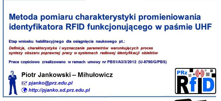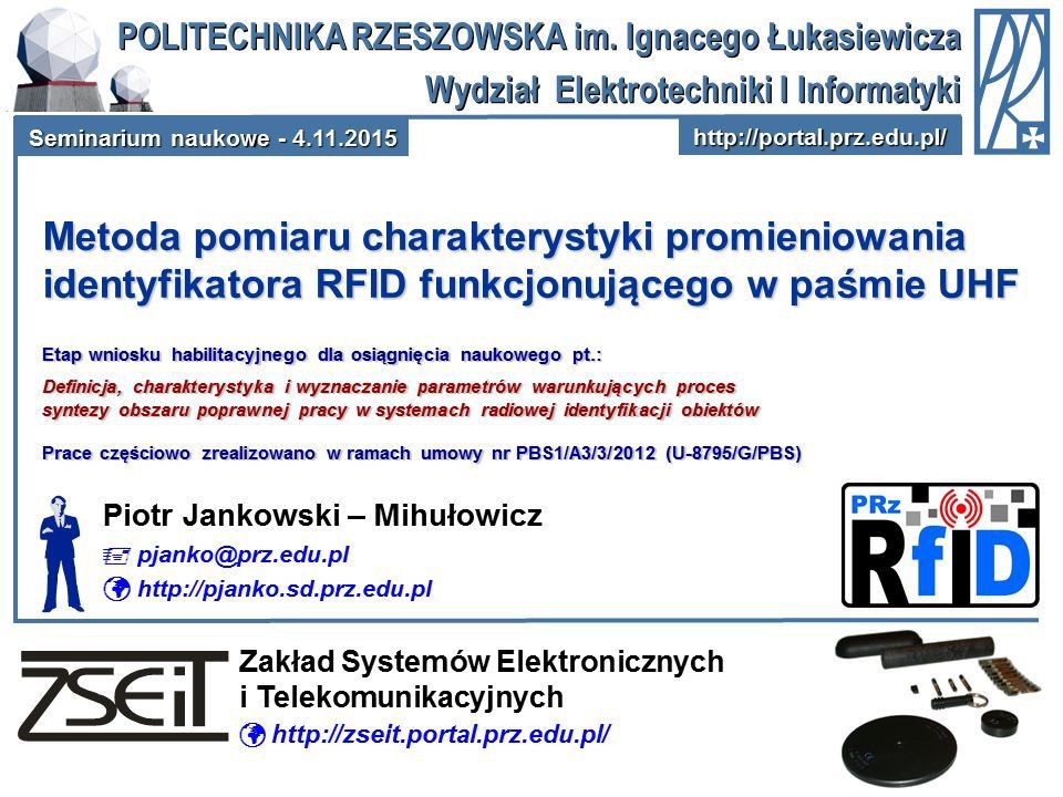W dniu 4 listopada 2015 r. w Zakładzie Systemów Elektronicznych i Telekomunikacyjnych Politechniki Rzeszowskiej odbyło się seminarium naukowe, podczas którego dr inż. Piotr Jankowski-Mihułowicz zaprezentował istotę opracowanej metody badawczej i uzyskane wyniki weryfikacji doświadczalnej w zakresie wyznaczania charakterystyki promieniowania identyfikatorów RFID pasma UHF. Omówione zagadnienia stanowią etap prac w zakresie przygotowywanego wniosku habilitacyjnego dla osiągnięcia naukowego pt.: "Definicja, charakterystyka i wyznaczanie parametrów warunkujących proces syntezy obszaru poprawnej pracy w systemach radiowej identyfikacji obiektów".