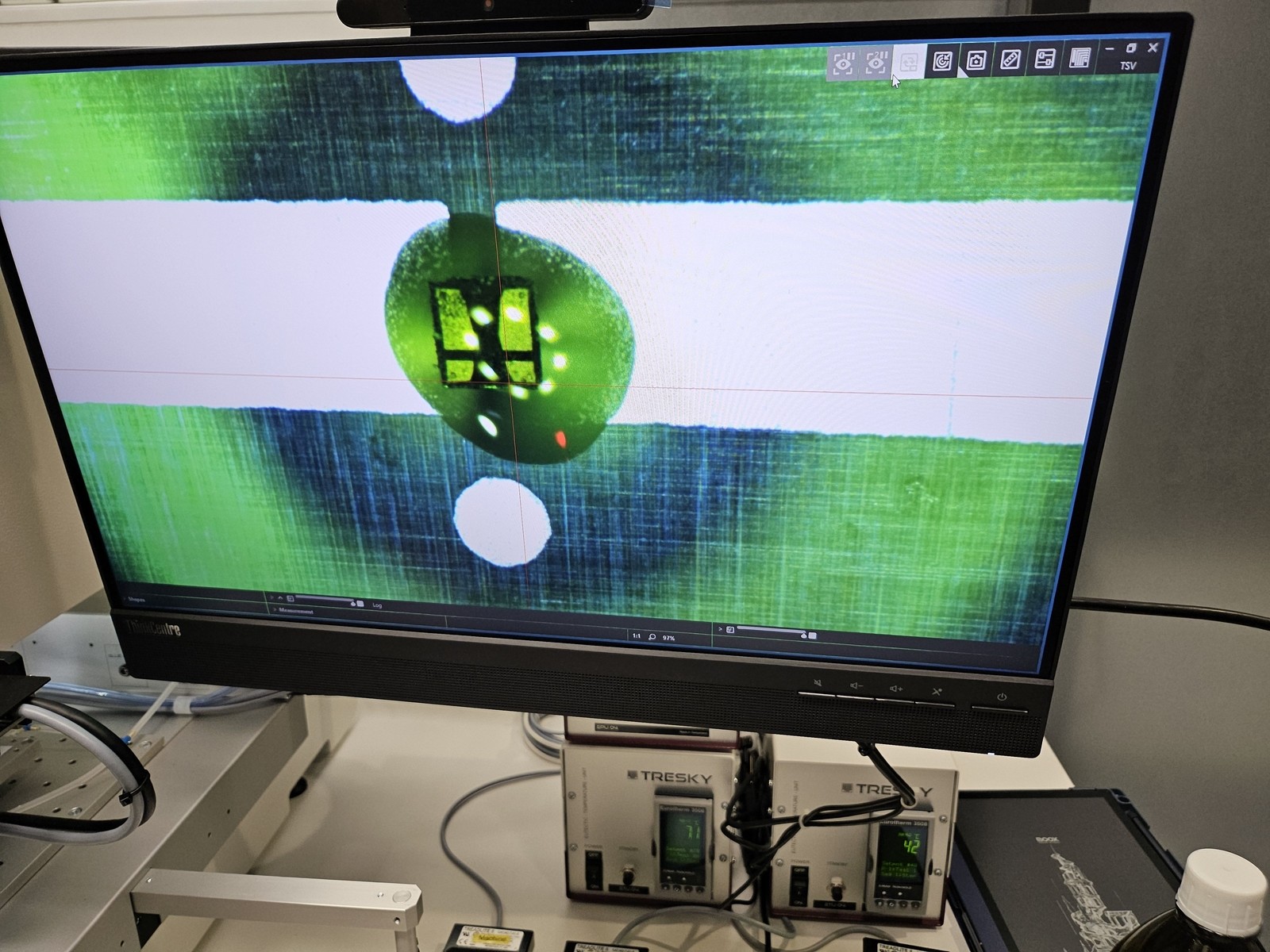 Po realizacji prac instalacyjnych odbyło się szkolenie, którym objęto konfigurację oraz obsługę systemu i jego oprogramowania. Zostało ono zrealizowane przez Erika Hofmanna (Service & Production Engineer) z firmy Dr. Tresky AG. W szkoleniu uczestniczyli wybrani pracownicy ZSEiT (dr hab. inż. Piotr Jankowski-Mihułowicz, prof. PRz, dr hab. inż. Mariusz Węglarski, prof. PRz, mgr inż. Kacper Skrobacz, mgr inż. Patryk Pyt, inż. Nikita Bailiuk), a także przedstawiciel partnera gospodarczego – mgr inż. Mateusz Chamera (Lead of RFID Tag Development) z Talkin Things SA. W trakcie tych prac m. in. pobierano z wafli krzemowych nieobudowane struktury półprzewodnikowe chipów identyfikatorów RFID pasma UHF i dokonywano ich montażu na elastycznych podłożach z układami antenowymi za pomocą epoksydowego kleju przewodzącego (adhesive bonding process).