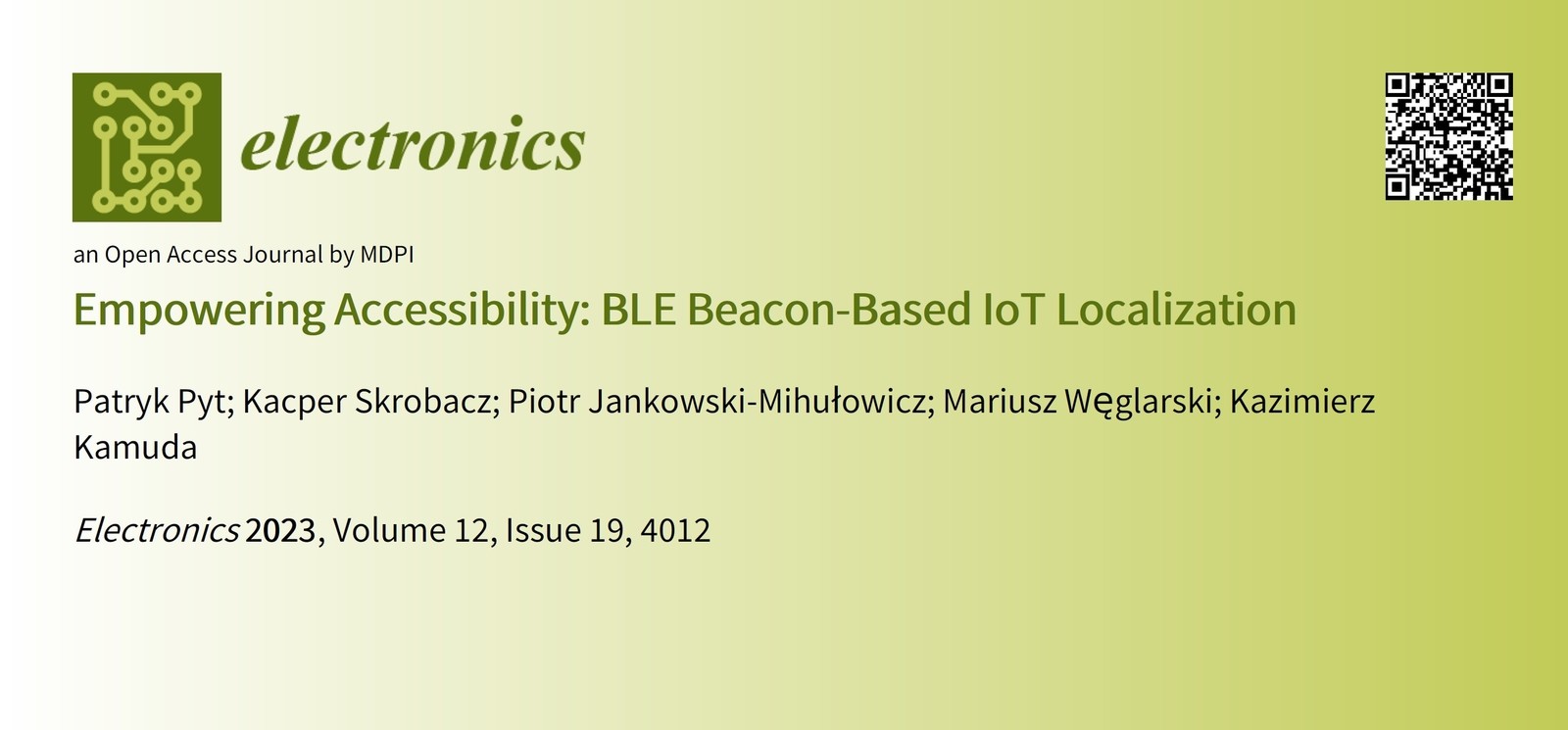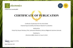 Pyt P., Skrobacz K., Jankowski-Mihułowicz P., Węglarski M., Kamuda K.: Empowering Accessibility: BLE Beacon-Based IoT Localization, Electronics, Vol. 12, No. 19, 4012, 2023 (DOI:10.3390/en16062626).