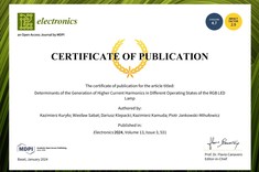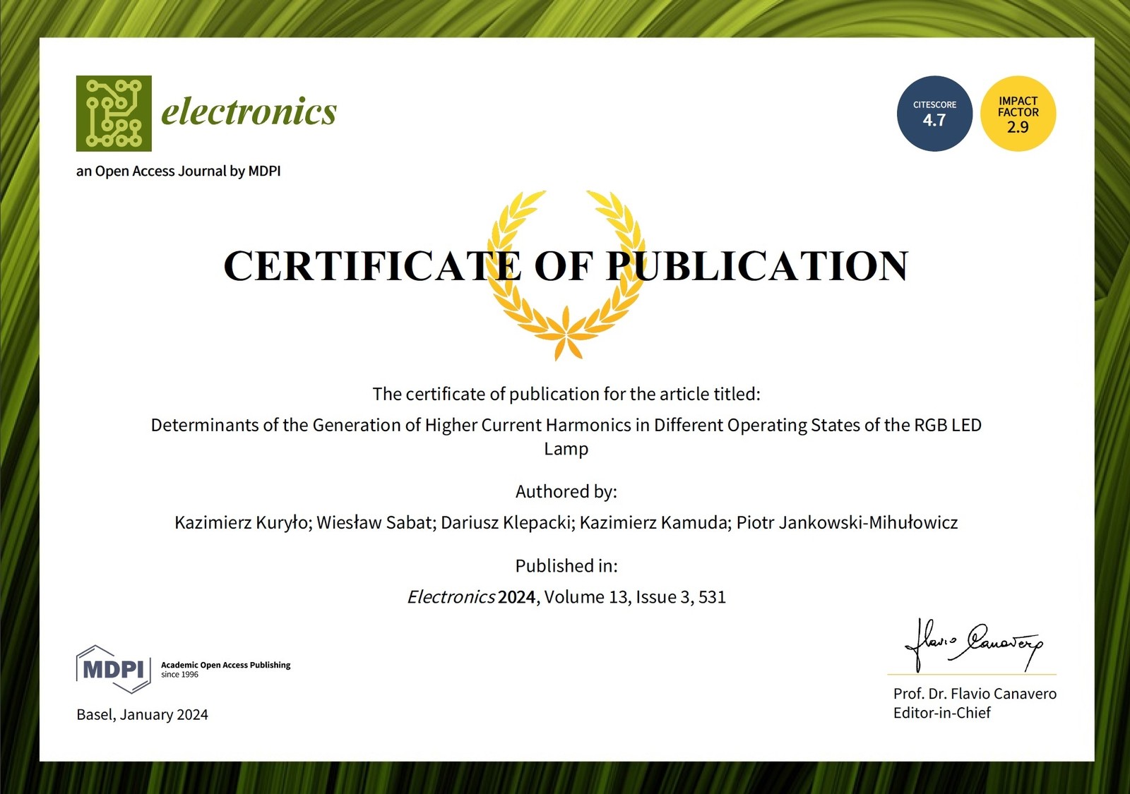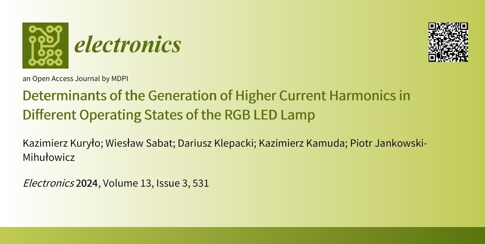 Kuryło K., Sabat W., Klepacki D., Kamuda K., Jankowski-Mihułowicz P.: Determinants of the Generation of Higher Current Harmonics in Different Operating States of the RGB LED Lamp, Electronics, Vol. 13, No. 3, 531, 2024 (DOI:10.3390/electronics13030531).