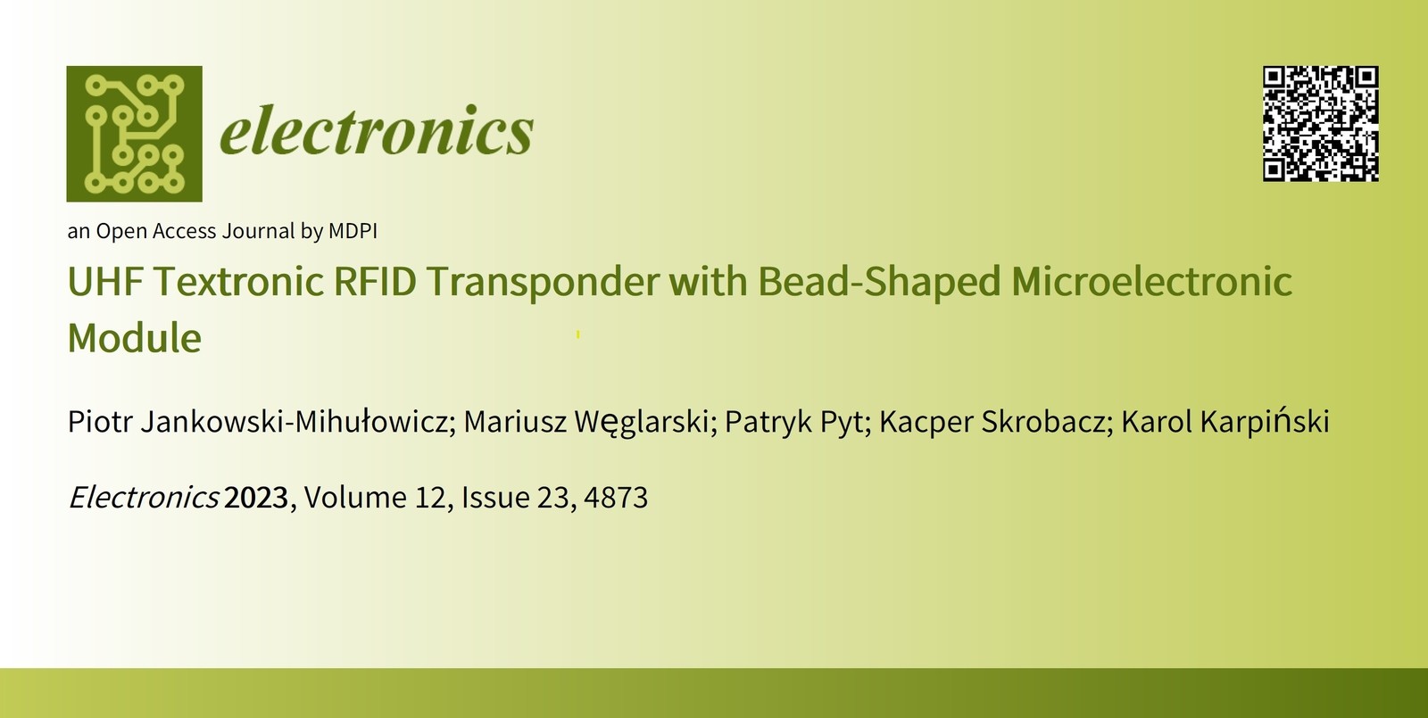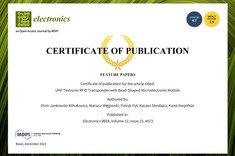 Jankowski-Mihułowicz P.: Węglarski M., Pyt P., Skrobacz K., Karpiński K.: UHF Textronic RFID Transponder with Bead-Shaped Microelectronic Module, Electronics, Vol. 12, No. 23, 4873, 2023 (DOI:10.3390/electronics12234873).