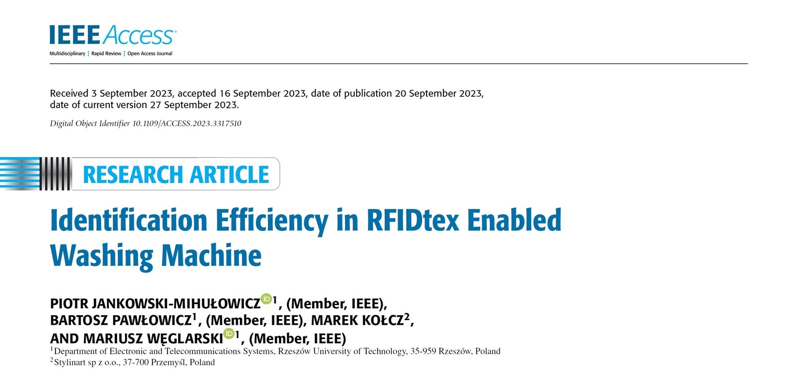 20 września 2023 r. w czasopiśmie IEEE Access (MEiN 100 pkt, IF: 3.476) ukazała się nasza kolejna publikacja dotycząca prac B+R+W związanych z tekstroniką. W artykule omówiono problem skuteczności identyfikacji elektronicznie oznaczonych tekstyliów, który dotyczy procesów prania w demonstratorze pralki przyszłości: