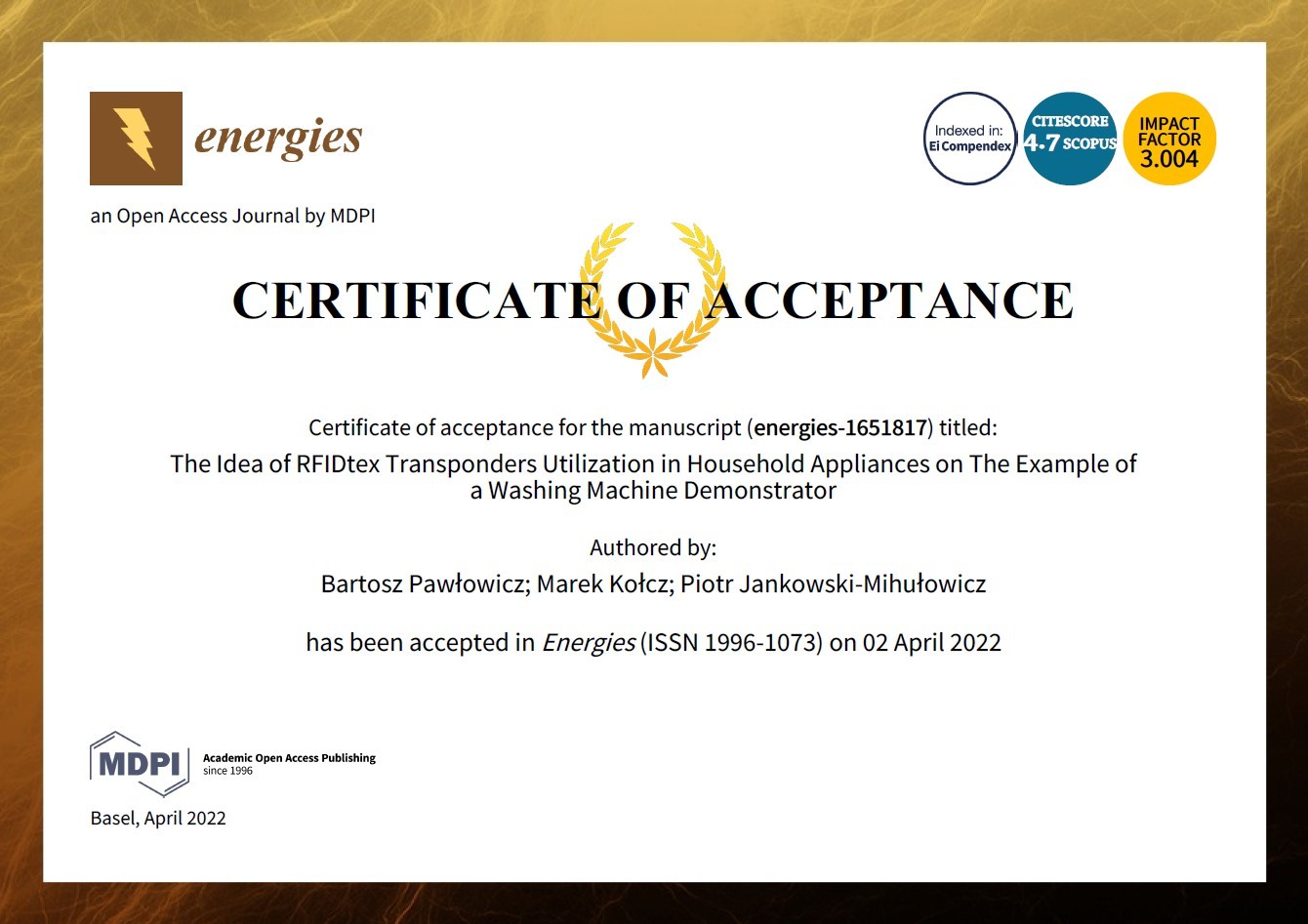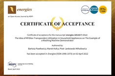 Pawłowicz B., Kołcz M., Jankowski-Mihułowicz P.: The Idea of RFIDtex Transponders Utilization in Household Appliances on the Example of a Washing Machine Demonstrator, Energies, ISSN: 1996-1073, Vol. 15, No. 7, 2639, 2022 (DOI: 10.3390/en15072639).