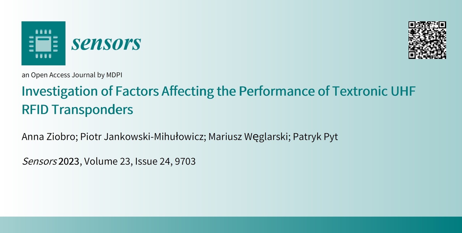 Ziobro A., Jankowski-Mihułowicz P., Węglarski M., Pyt P.: Investigation of Factors Affecting the Performance of Textronic UHF RFID Transponders, Sensors, Vol. 23, No. 24, 9703, 2023 (DOI:10.3390/s23249703).